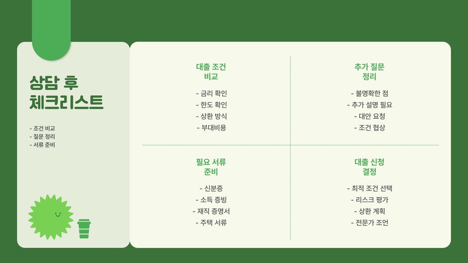 - 상담 후 대출 신청 절차를 잘 따르세요.