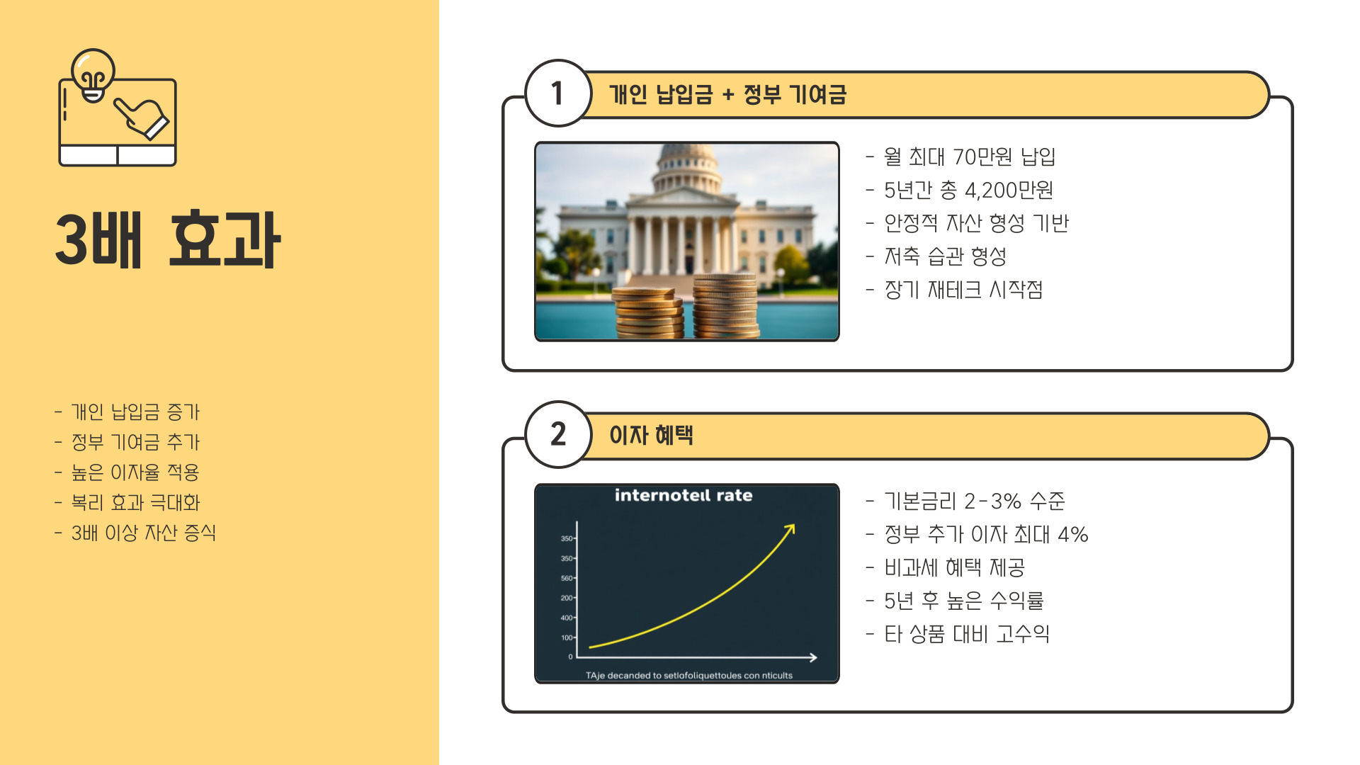 - 정부 지원을 통해 저축금의 3배 효과를 누릴 수 있습니다.